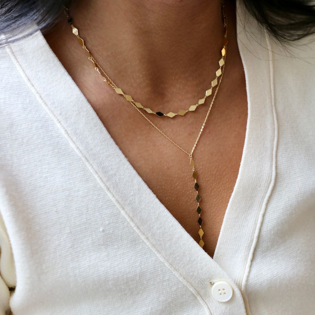 Elevate your style with this incredible diamond-shaped 10k yellow gold gold necklace. Pairs perfectly with the Diamond Disc Lariat Necklace.