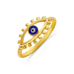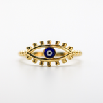 This yellow gold ring, showcases a unique evil eye motif, representing safeguarding and prosperity. Expertly detailed with enamel, the eye adds a vibrant element to the gold base. Perfect for daily use or special events, this ring merges traditional symbolism with contemporary fashion, making it an everlasting accessory.